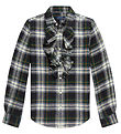 Het Polo Ralph Lauren overhemd heeft lange mouwen met gepofte schouders en smalle elastische randen en een brede volantafwerking met veter. In de halsopening zit een mooi kraag versierd met veter en plooien. Aan de voorkant zitten grote rushes met kanten details. Het Overhemd gaat aan de voorkant open met knoppen. Het Overhemd is gemaakt in een lichte, strak geweven katoenkwaliteit en aan de binnenkant zit een katoenen jersey top met smalle schouderbandjes.