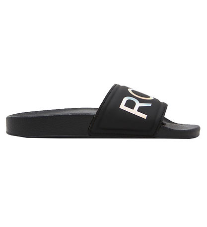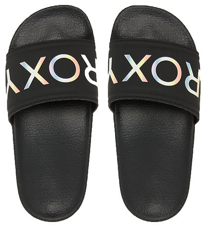 Leuke Roxy badslippers in het zwart met "Roxy" in verschillende gekleurd op het bandje.
