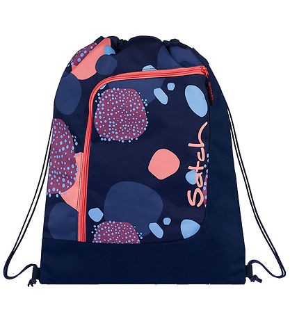 Mooie Satch sporttas in marineblauw met koraalrifprint in paars en lichtblauw en met roze logo.