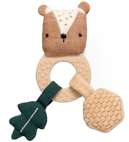 De Sebra activiteitenrammelaar bestaat uit een bijtring met knoppen, met bovenaan een berenkop en een blad en een stukje van een bijenkorf, leuk en leerzaam voor de kleintjes om mee te spelen.