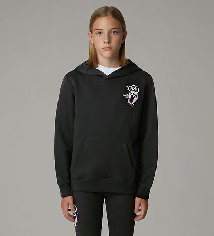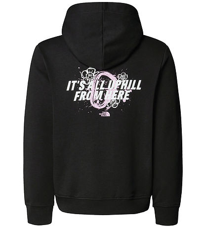 Smart The North Face hoodie in zwarte sweat, en op de achterkant staat een grote print met de tekst "It's All Uphill From Here" gedrukt in het wit met roze details.