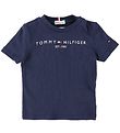Mooi Tommy Hilfiger t-shirt in donkerblauw met een rode merkprint op de borst met het woord "Tommy" en een discreet logoborduursel aan de buitenkant van de linkermouw. Het Tommy Hilfiger t-shirt heeft een rond hals en korte mouwen, wat zorgt voor een klassiek en tijdloos design.