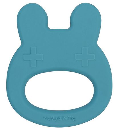Mooi We Might Be Tiny bijtring van petrol silicone in de vorm van een lief konijnenhoofd met kruisen als oogjes.