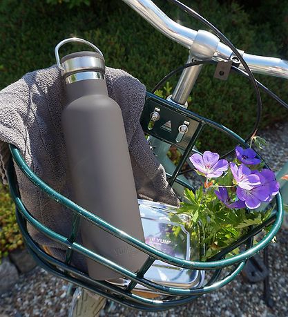 Mooie Yummii Yummii thermofles in het grijs met een bruine tint. Aan de onderkant zit een logo, en de bovenkant van de deksel is van grijs bamboehout.