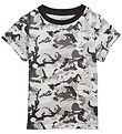 Mooie adidas Originals t-shirt met camouflage print in grijs, wit en zwart en op de linker zijkant zit een klein, wit logo.