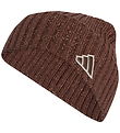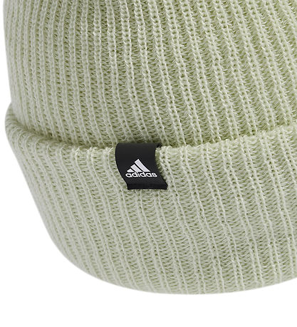 Leuke adidas Performance muts in dusty groen breisel, met een geborduurd, wit "adidas" aan de voorkant op de brede rand.