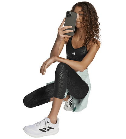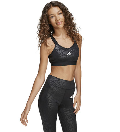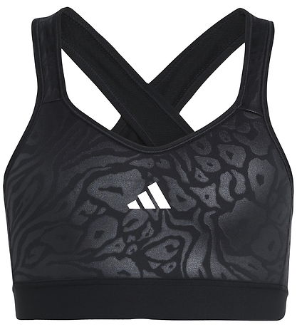 Stoere adidas Performance sport bh in het zwart met een glanzende dierenprint. De top heeft brede schouderbanden die elkaar op de rug kruisen en aan de onderkant een brede elastische kant. De top is gemaakt van een zachte en rekbare kwaliteit en heeft een mesh aan de achterkant.