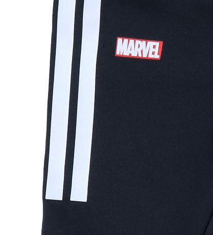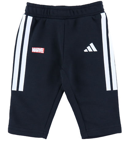 - De joggingbroek is zwart met een wit logoprint op de linkerdij, een rood Marvel-logo op de rechterpijp en de klassieke adidas strepen langs beide pijpen.
