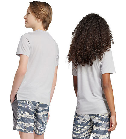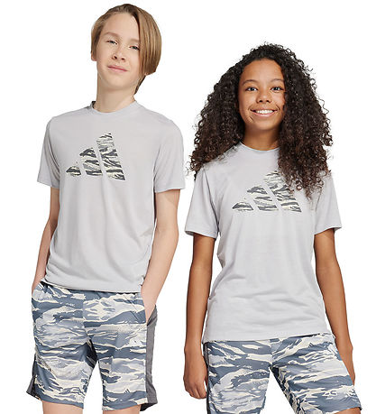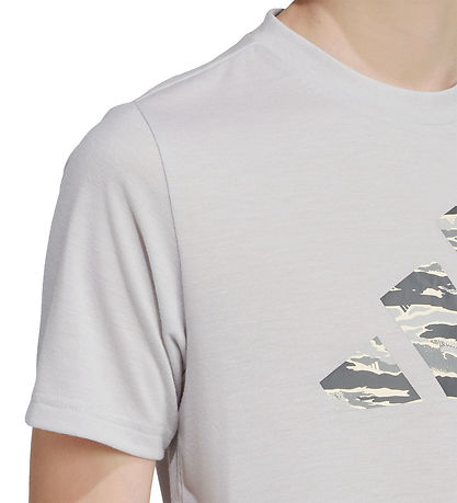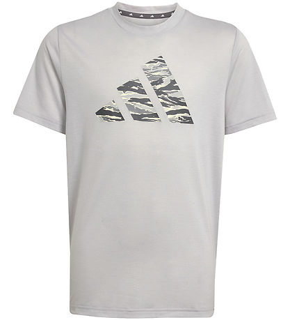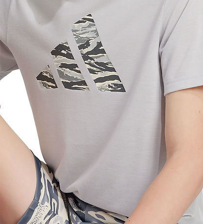 Leuke adidas Performance T-shirt met korte mouwen in een grijs kleur en een grote logoprint in camouflagepatroon op de voorkant. T-shirt combineert stijl met functionaliteit voor de actieve garderobe.