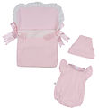 De Asi blouse is uitgevoerd in het wit met een allover bloemenprint in blauw en beige tinten, en met een brede volant met dezelfde print in de nek. De bloeiers zijn in het blauw met een wafel en fijne gespen over de schouders en hebben elastische randen in alle openingen. De Muts heeft een blauw wafel, met een brede wit ruche met dezelfde bloemenprint als op de blouse, in de hoofdopening en met witte strikbanden onder de nek.