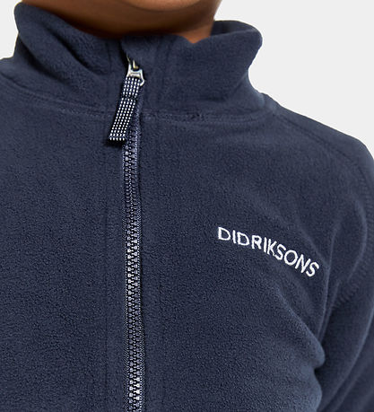 Heerlijk Didriksons fleece jas in navy met een wit geborduurd logo op de linkerborst.