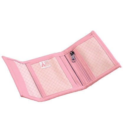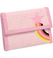 Mooie Djeco portemonnee in roze met een oranje geruit en aan één patroon is een kleurrijke regenboog bedrukt.