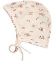 Schattige Fixoni babymuts met een patroon in witte en bruin. De Fixoni babymuts heeft een rond vorm en sluit onder de kin met een drukknop met twee standen.