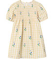 Charmante Fliink- jurk met korte mouwen in een lightgeel kleur met een schattige bloemenprint. De Jurk heeft sieradentafel op de borst en fijne details die hem een lieflijke uitstraling geven.