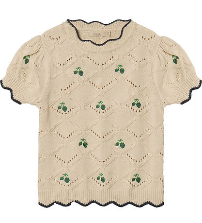 Leuke Fliink t-shirt in een beige gebreid met een mooi gat en breipatroon. T-shirt is versierd met fijn borduurwerken van braambes in blauw en groen.