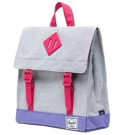 Mooi Herschel rugzak in grijs met gevlekt details in paars en roze. Voorop staan twee Herschel-logo's in de vorm van een roze rubberen logo en een wit en zwarte applicatie. De binnenkant van de rugzak heeft een mooi print van rode en wit strepen.