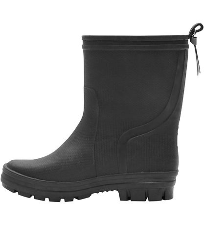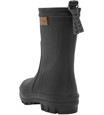Fijne Hummel regenlaarzen in zwarte waterproof TPR met een fijn, bruin brand met het logo erop. Aan de achterkant zit een fijne hanger met de kenmerkende hoeken, wat een praktische reflex is. De Regenlaarzen hebben ook een mooi patroon in de structuur.