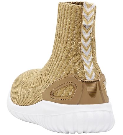 Prachtige Hummel schoenen met een gehaakt bovenwerk in goud met glitterdraden, gemaakt van gerecyclede materialen. Op de hiel zit een logobandje met Hummel hoeken in goud en wit, wat ook een praktische functie heeft bij het aantrekken.