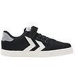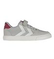 De Hummel schoenen hebben elastische veters over de voet en sluit af met klittenband. De schoenen hebben uitneembare binnenzolen en de buitenzolen zijn van wit rubber.