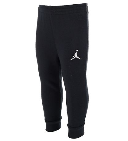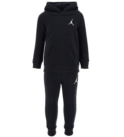 Leuke Jordan sweatset, die bestaat uit een hoodie en een paar in het zwart, en aan de linkerzijde hebben beide onderdelen een wit logo met zwarte randen.
