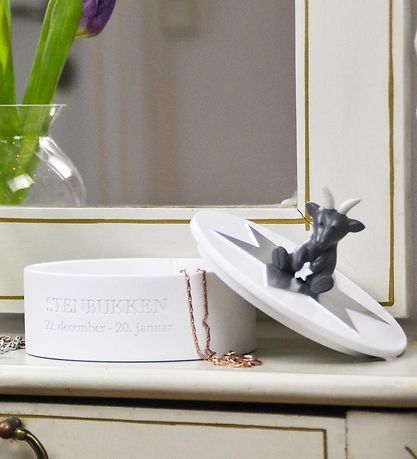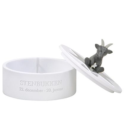 Mooi wit Kids by Friis sieradendoos met het sterrenbeeld Steenbok. Bovenop zit een schattige figuur, die het sterrenbeeld zou moeten illustreren, en de figuur houdt een ster vast die licht op in het donker. Op de voorkant staat "Steenbok" en de dierenriemperiode.