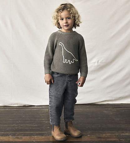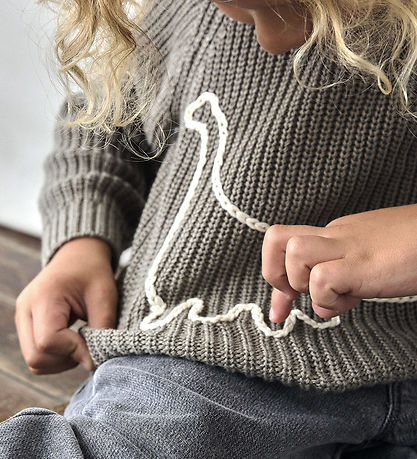 Smart Lil Atelier blouse met ribstructuur in dusty met een wit dinosaur op de voorkant. De blouse heeft een rond hals en lange mouwen. De Blouse heeft brede geribte kanten bij alle openingen.