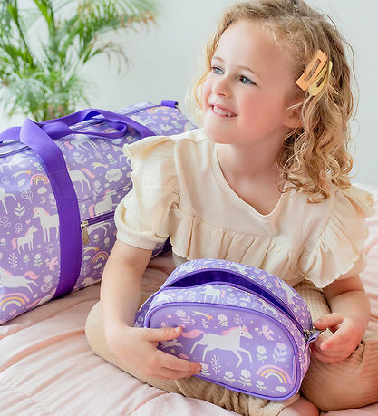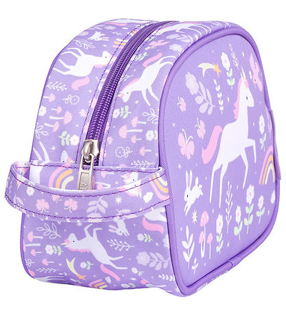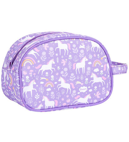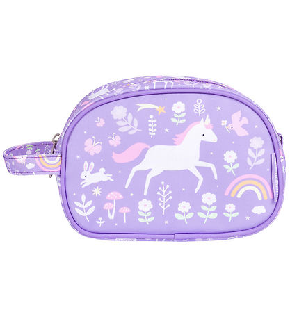 Sweet A Little Lovely Company toilettas in paars met een allover print van eenhoorns, regenbogen, bloemen en vallende sterren.