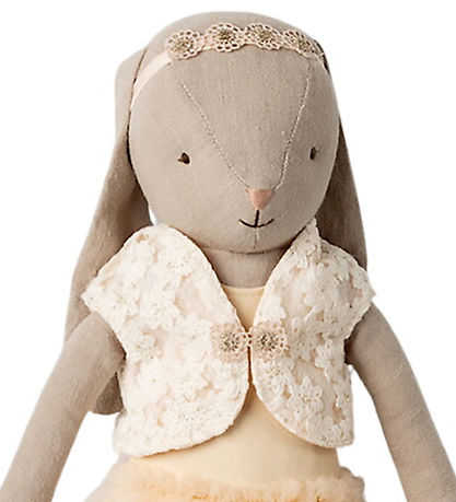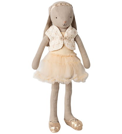 Mooie Maileg konijn in lichtgrijs, gekleed in een geel ballettutu, een tule rok en een mooie vest.