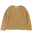 Elegante blouse van MarMar met lange mouwen in een mooi breistructuur. De Blouse heeft een mooie, groenbruine tint met een subtiel gevlekt patroon in verschillende kleuren. Hij heeft een rond hals en geribte kanten aan zowel de mouwen als de onderkant, wat zorgt voor een klassieke look.