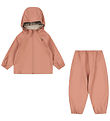 Mooi MarMar regenkleding met strepen in beige en navy, gemaakt van praktisch PU. De Regenkleding bestaat uit een regenjas en een regenbroek met gespen.