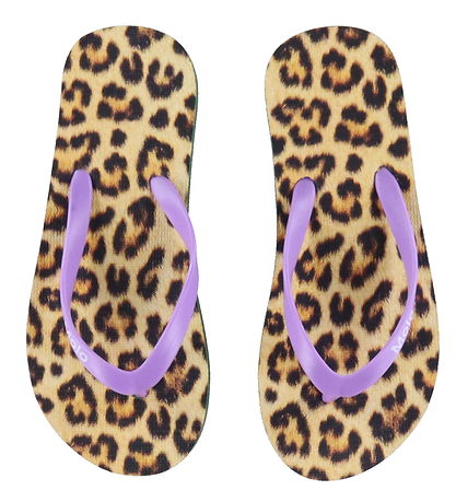 Slimme Molo slippers met luipaardprint en paars bandjes.