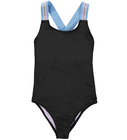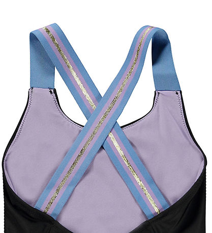 Smart Molo zwempak in het zwart met elastisch schouderbandjes in een blauw, lila en goud gestreept dessin.