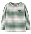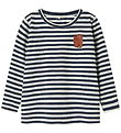 Charmante Name It blouse met lange mouwen in een klassiek streepjespatroon in lichtbruin en wit. De Blouse heeft een comfortabele rond hals en op de borst zit een klein detail met een geborduurd voertuig, wat het ontwerp een unieke touch geeft.