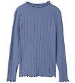 Elegante Name It blouse met lange mouwen in een prachtige blauw kleur. De Blouse is ontworpen met een brede ribstructuur die een verfijnde dimensie toevoegt. De halslijn heeft fijne golvende randen, die terugkomen in de mouwen en onderkant van de blouse.