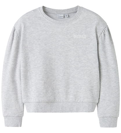 De Name It sweatshirt heeft lange mouwen met een licht pofeffect bij de schouders en een rond hals met een smalle geribte kant. De taille en mouwopeningen hebben brede geribte kanten en de binnenkant is zacht en geborsteld.