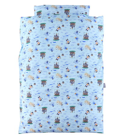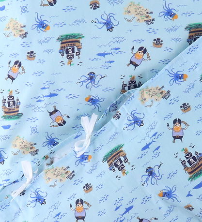 Stoer Nørgaard Madsens beddengoed in lichtblauw met een blauwe print met golven en octopussen en prints met piraten, piratenschepen en verlaten eilanden met een schat.