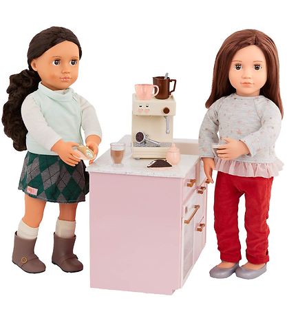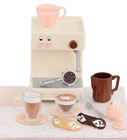 In de Our Generation set zit een groot espressomachine die drie verschillende geluiden kan afspelen, waardoor het nog levensechter wordt als de poppen een beker koffie moeten zetten. Het Meegeleverd onder meer ook beker, borden, melkkannen en andere accessoires voor het koffiestation.