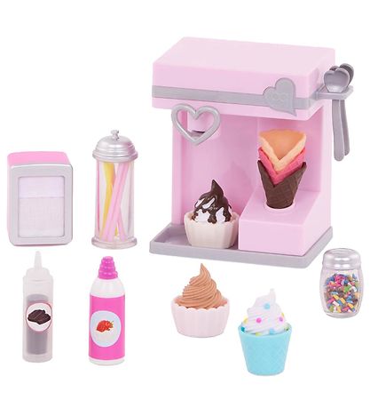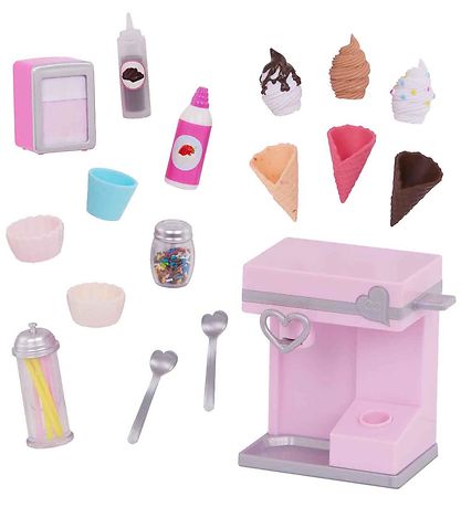 De Our Generation set bevat een groot ijsmachine die een lieve melodie kan spelen als je op de dispenser drukt. Meegeleverd diverse soorten softijs met crumbles, ook wafels, cups en tubes met saus.