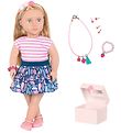 Flora heeft donkere ogen die open en dicht kunnen. Ze draagt een mooi zomerjurk, een bolero en nette sandalen. Samen met Flora krijg je 2 hairextensions, een kam, 2 haarspelden en een boek met kapseltips.