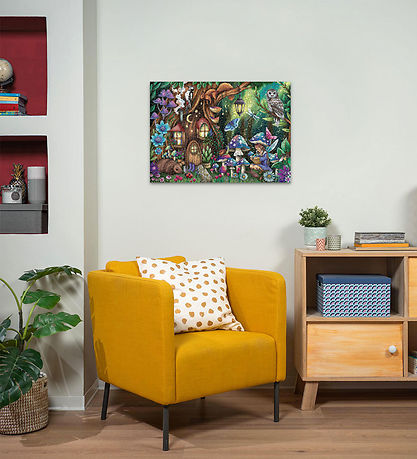 Betoverende Ravensburger puzzel met bos, met onder andere een boomhut, dieren en paddenstoelen.