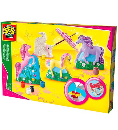 De SES Creative giet- en schilderset is perfect voor creatieve kleintjes die hun eigen spel willen creëren. Met de set kun je verschillende paarden boetseren, die vervolgens in prachtige kleuren kunnen worden geverfd en versierd met glitter.