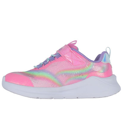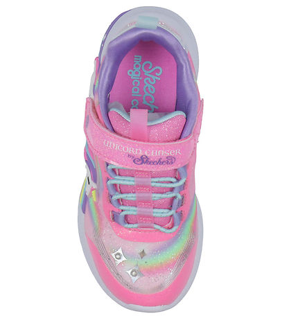 Kleurrijke Skechers schoenen in roze glitter met regenbogen en een 3D eenhoorn aan de buitenkant.