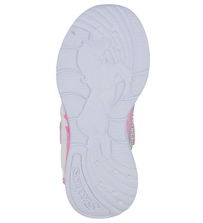 De Skechers schoenen hebben elastische band over de wreef, en worden strakgetrokken door middel van klittenband. Aan de achterkant zit een praktisch bandje en ze hebben een Fast hielkap. Binnenin zit paars textiel met extra vulling rond de opening. De schoenen hebben een sterke buitenzool die iets boven de teen omhoog gaat ter bescherming tegen slijtage. De buitenzool is gemaakt van lichtgewicht materiaal met een slippatroon onder de onderkant, dat een eenhoorn voorstelt.