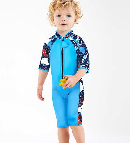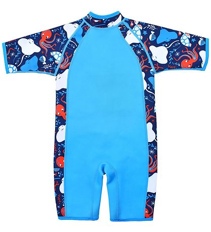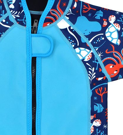 Smart Splash About duikpak in blauw, met navy mouwen en zijkanten met een allover print van verschillende vis en dingen uit de zee in rood, wit en blauw.