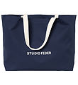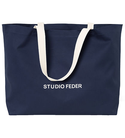 Mooi Studio Feder weekendtas in marineblauw met witte hengsels en wit logoprint.