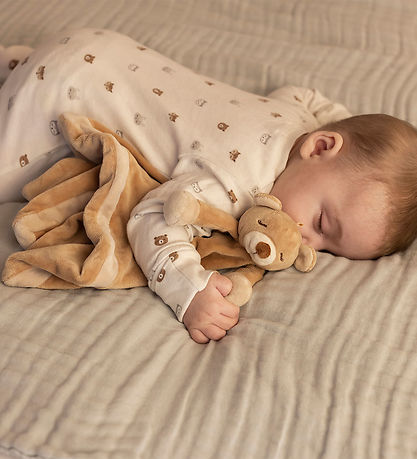 Mooie knuffeldoekjes Teddykompaniet in de bruin, met een beige rand en een beer met armen erop.