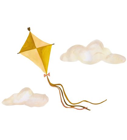 Prachtige That's Mine wanddecoratie van een geel draak met een oranje vlinderdas en twee zwevende wolken.