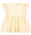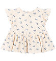 De top is mouwloos en heeft kanten met rushes op de borst. Bij de hals kan de top helemaal dichtgeknoopt worden met met stof beklede knoppen.