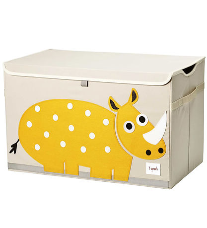 Morsom 3 Sprouts oppbevaringsboks i beige med et søtt, gult neshorn på. Boksen har en firkantet og langstrakt form med et sammenleggbart lokk øverst.