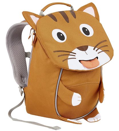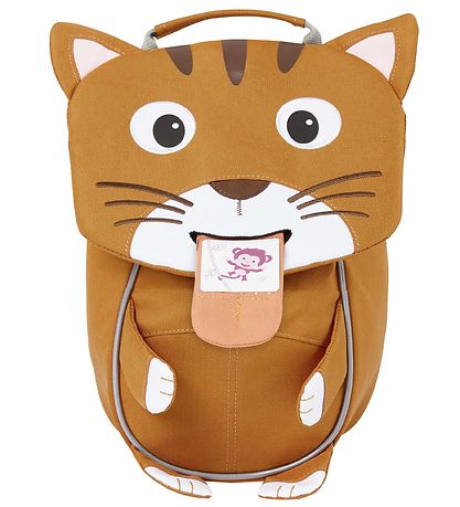 Søt Affenzahn ryggsekk i brune nyanser med form som en katt. Foran er det to stor øyne, ører og en munn som stikker ut en tunge. Pungen er festet med et strikk, og når du trekker i den kommer et navneskilt til syne.